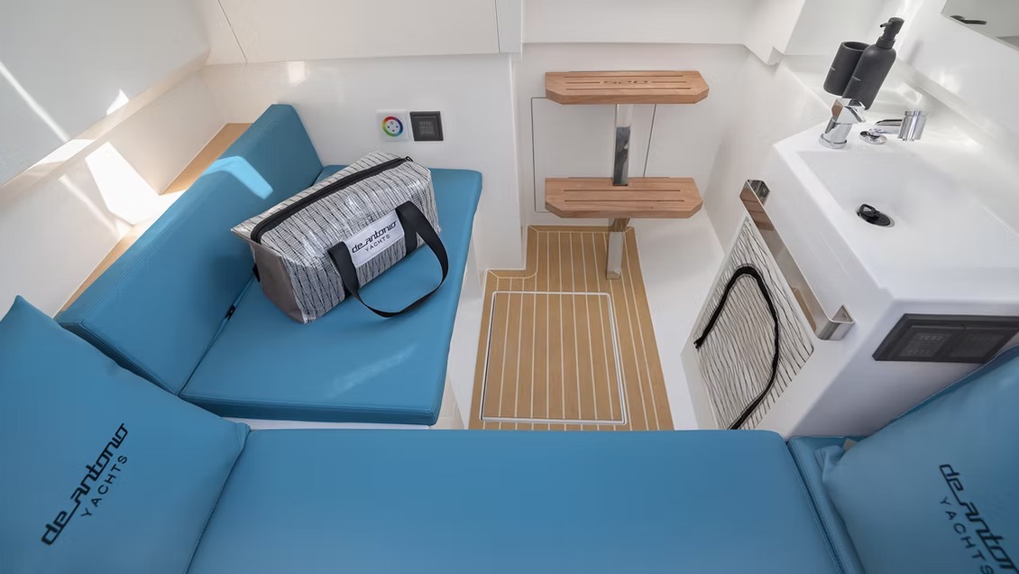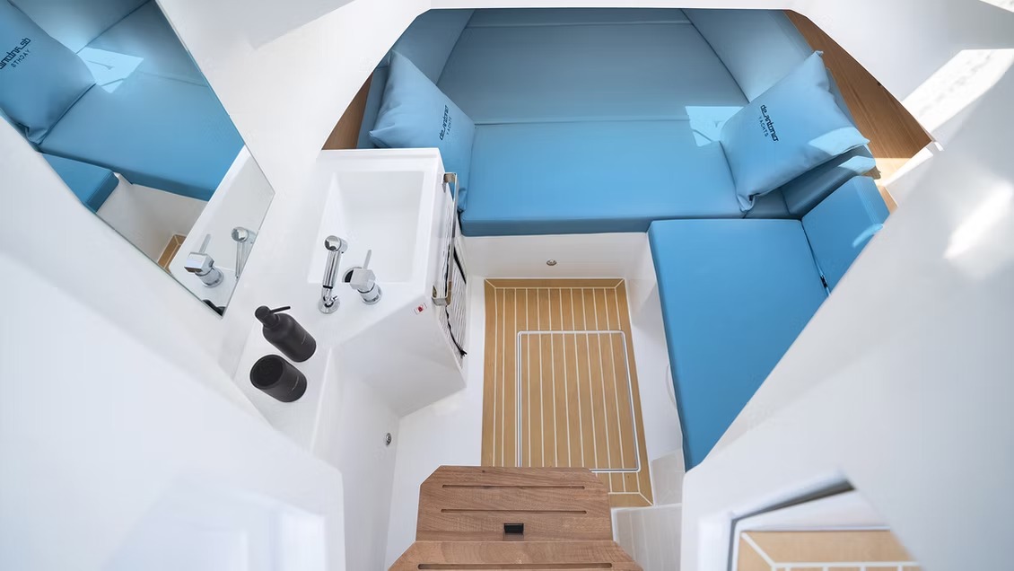 Wnętrze skrywa zaskakująco przestronną kabinę dziobową z łóżkiem dwuosobowym oraz pełnowymiarową łazienką.
