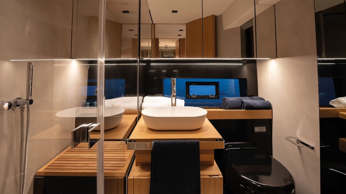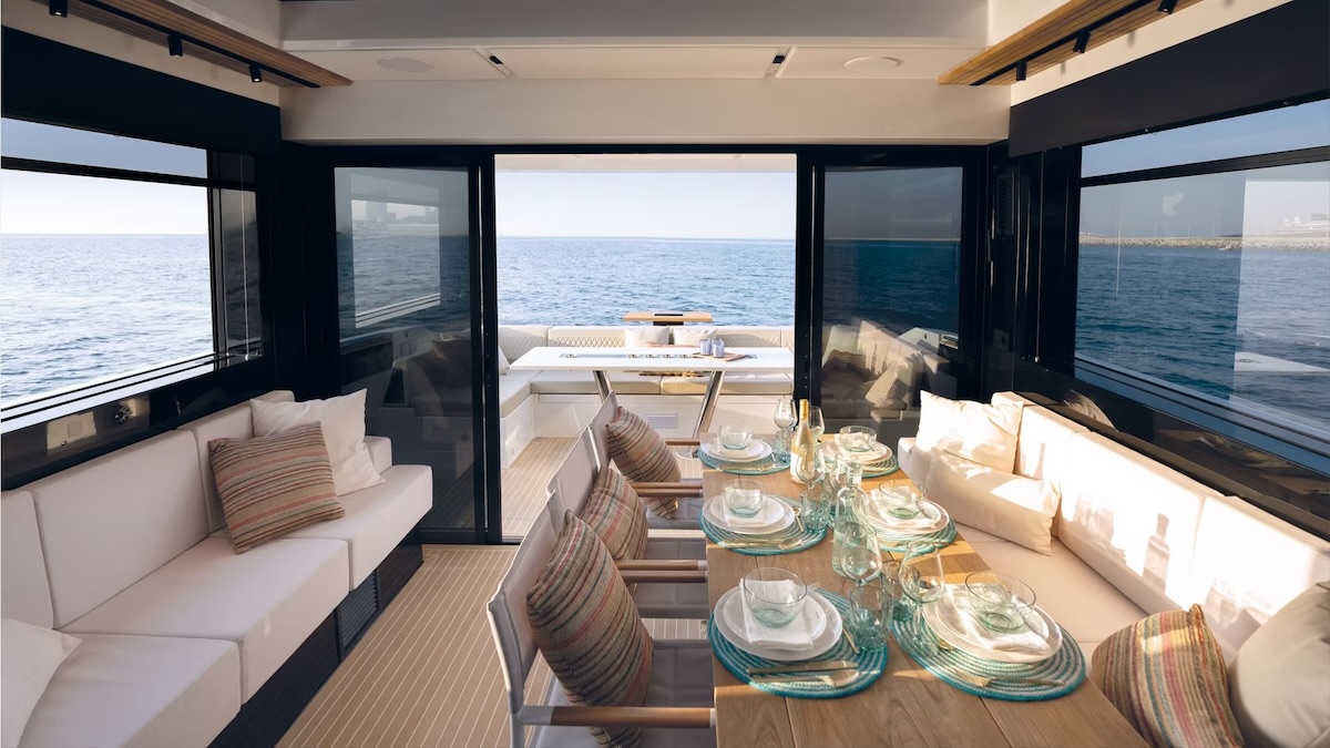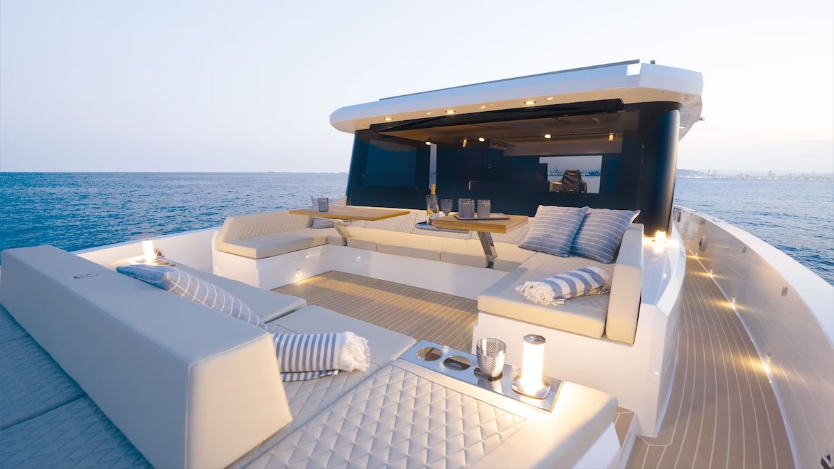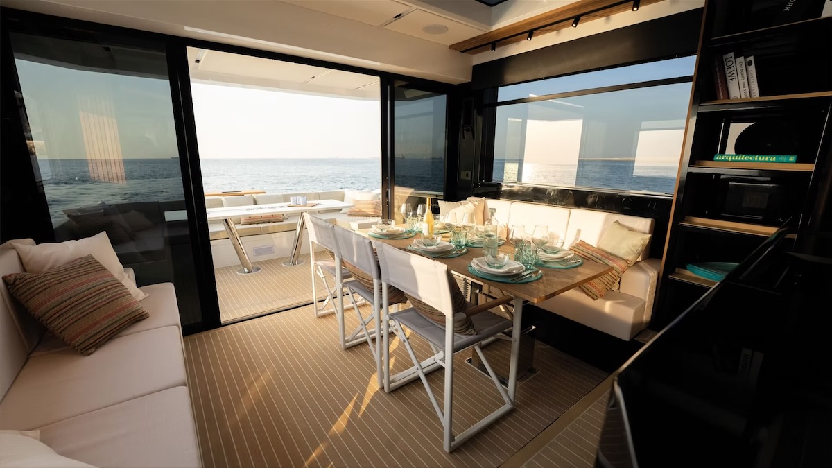 Przemyślany, przestronny układ zapewnia komfort dla 12 osób, oferując 2–3 kabiny, w pełni wyposażoną kuchnię (galley) oraz rozległe strefy wypoczynkowe, w tym sofę na pokładzie dziobowym i opcjonalne jacuzzi.