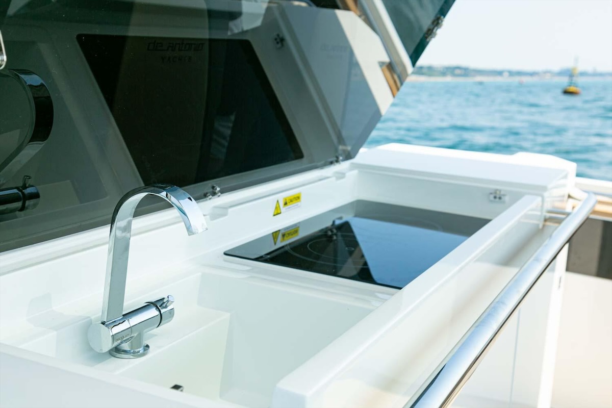Charakterystyczna dla marki czysta linia nadbudowy, wysokiej klasy materiały oraz dbałość o detale podkreślają prestiżowy charakter jachtu De Antonio Yachts.