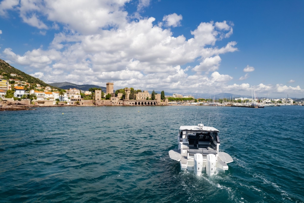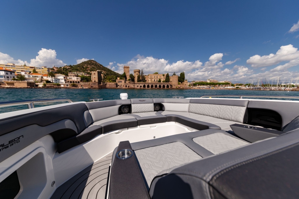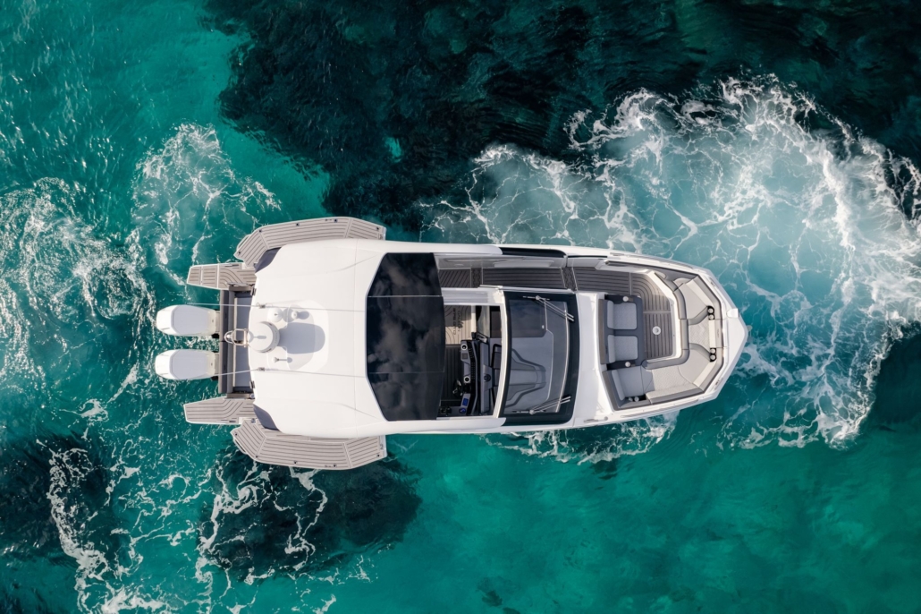 Poniżej pokładu goście są witani przez pełnowymiarowy salon z przesuniętą częścią siedzącą ku przodowi. Dzięki przekształcalnej sofie i obszarowi dla gości, dostępne są cztery miejsca do spania na noc. Właściciele mogą wybrać dodatkową przestrzeń do przechowywania w salonie lub kompaktową kuchnię wyposażoną w niezbędne urządzenia dla przedłużonych podróży. Funkcjonalna łazienka oferuje oddzielne pomieszczenia toaletowe i prysznicowe, z wysokim stojącym pomieszczeniem, oświetlone przez ogromne okna.