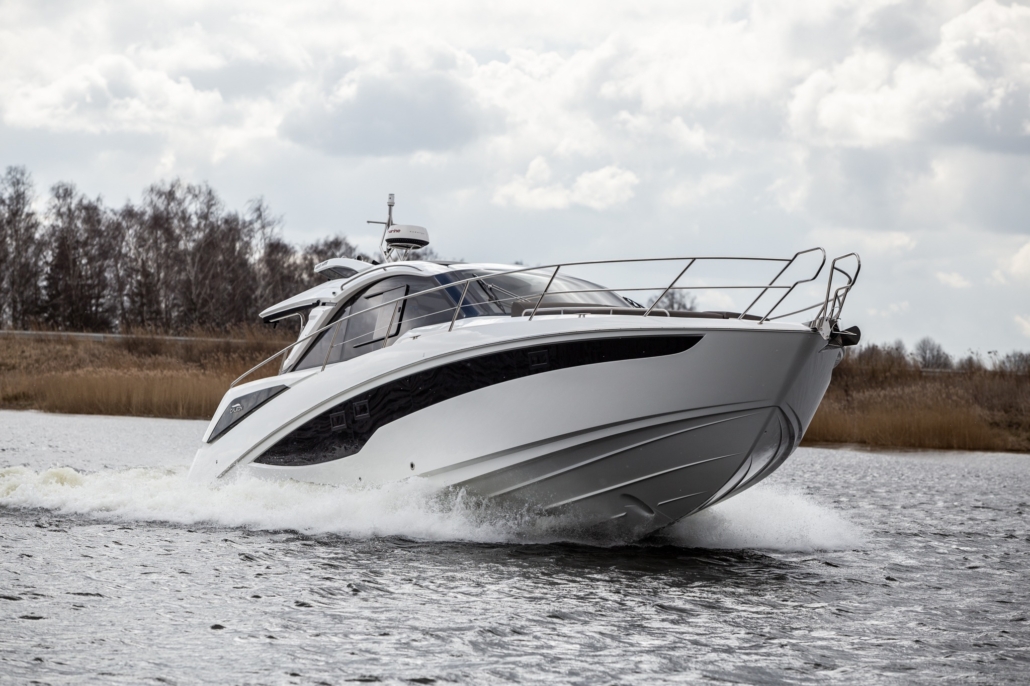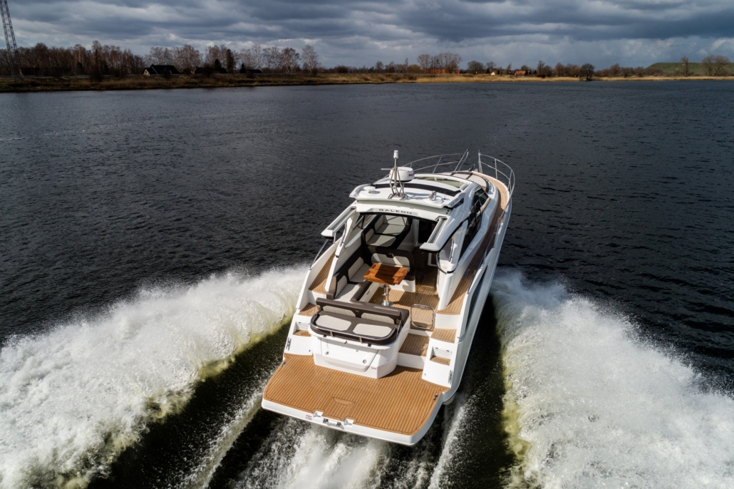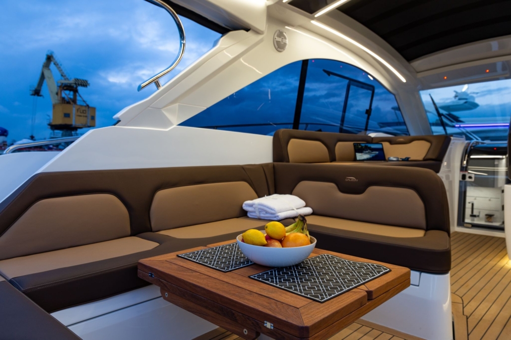 Galeon 405 HTS to wyrafinowany i funkcjonalny jacht motorowy z twardym dachem. Ten model oferuje jasne i przestronne wnętrze oraz niezapomniane doświadczenia. Rozszerzony dach nad kokpitem zapewnia dodatkową ochronę przed słońcem. Kokpit z kuchnią na zewnątrz i przekształcanymi leżakami zapewnia dodatkową przestrzeń na spotkania. Jacht oferuje rozszerzoną platformę kąpielową z łatwym dostępem do garażu na zabawki. Bardzo interesującą cechą tego jachtu jest plandeka, która zmienia się w otwierany szyberdach nad stanowiskiem kierowania. Dostosuj wnętrze do swoich upodobań, wybierając spośród szerokiej gamy dostępnych opcji i wyposażenia.