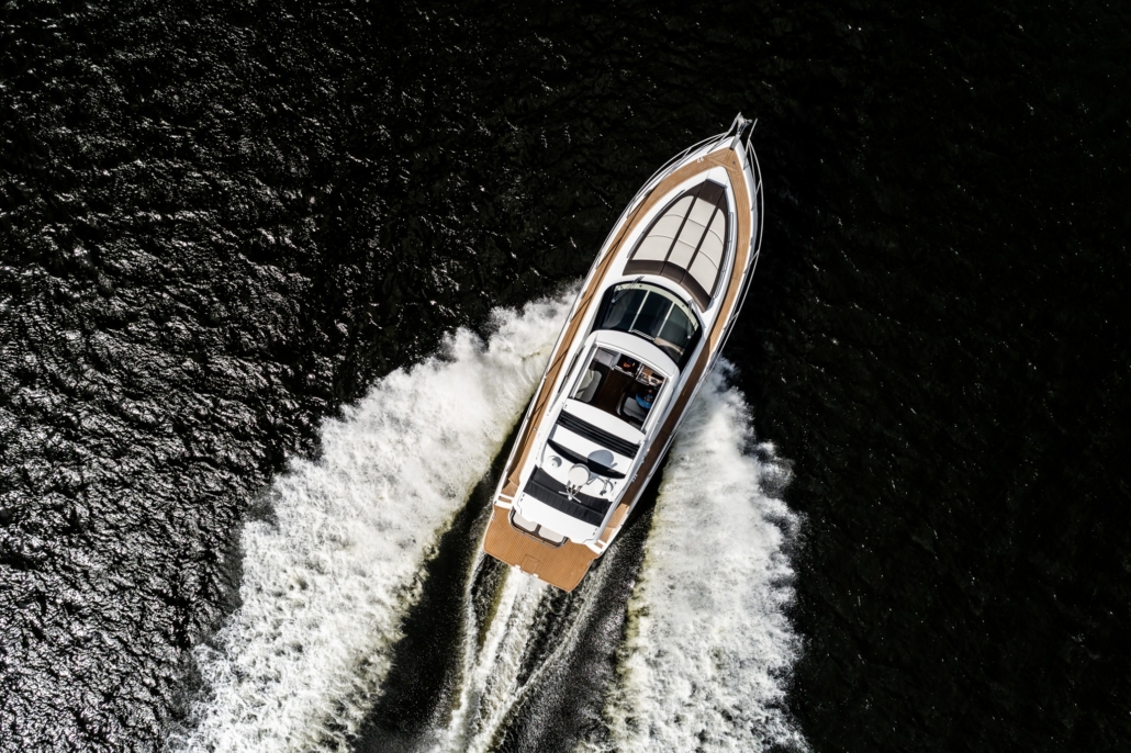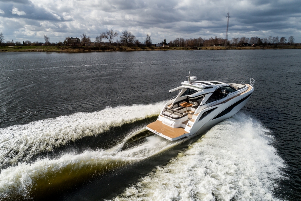 Duże okna dodają naturalnego światła do salonu, kuchni i kabin gościnnych. Ogromny salon na głównym pokładzie będzie popularnym miejscem spotkań dla rodziny i przyjaciół, z barem po prawej stronie, który dodaje otwartego uczucia. Przestrzeń do spania na niższym pokładzie obejmuje w pełni wyposażoną kuchnię i dwie kabiny z oddzielnymi łazienkami. Suite właściciela zajmuje całą szerokość jachtu, zapewniając dużo miejsca do przechowywania.