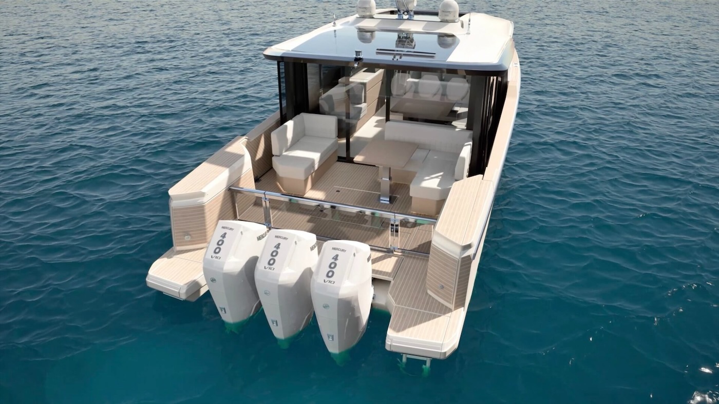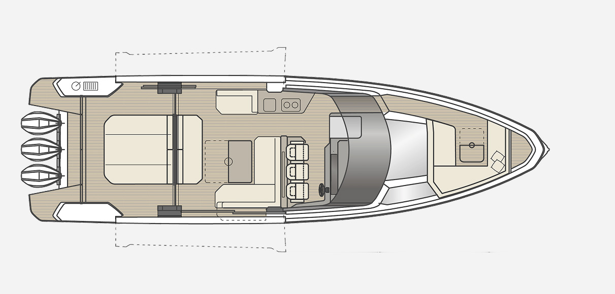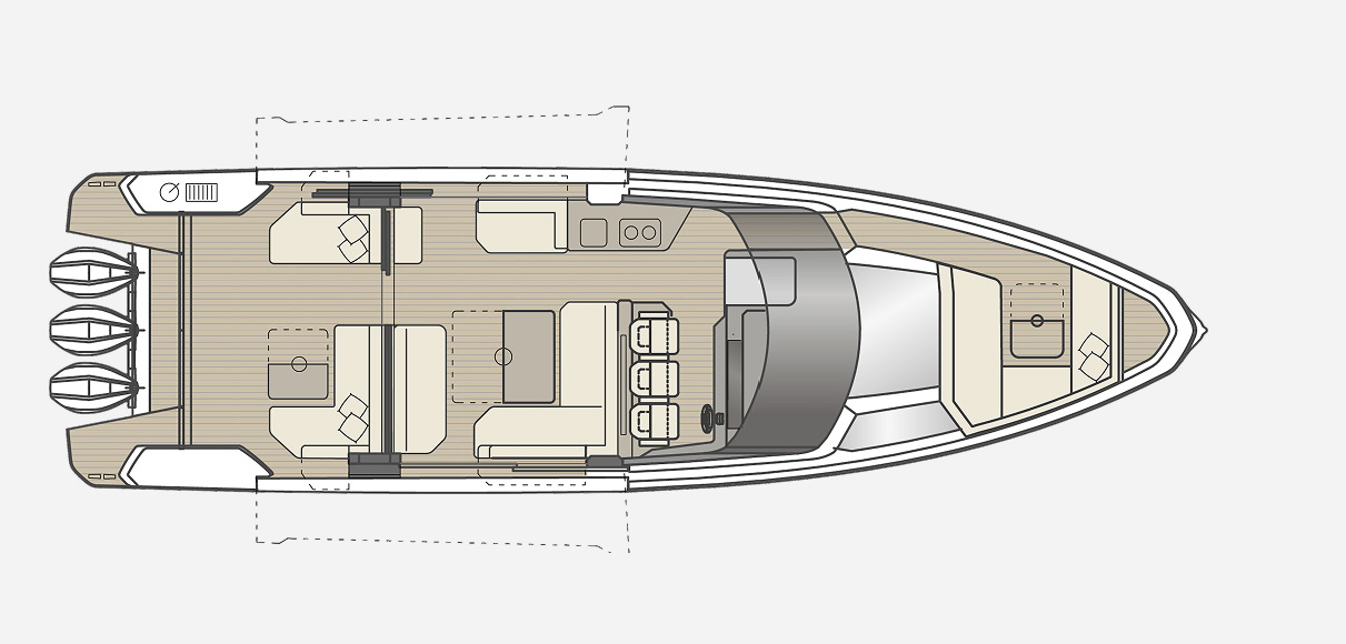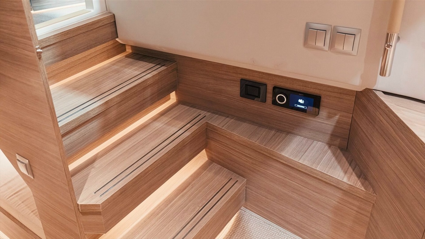 Rozkładane burtowe tarasy Saxdor pozwalają wykorzystać pełną szerokość pokładu głównego. W połączeniu z otwartą sterówką przestrzeń otwiera się od burty do burty, sprawiając, że morze staje się naturalną częścią pokładu.