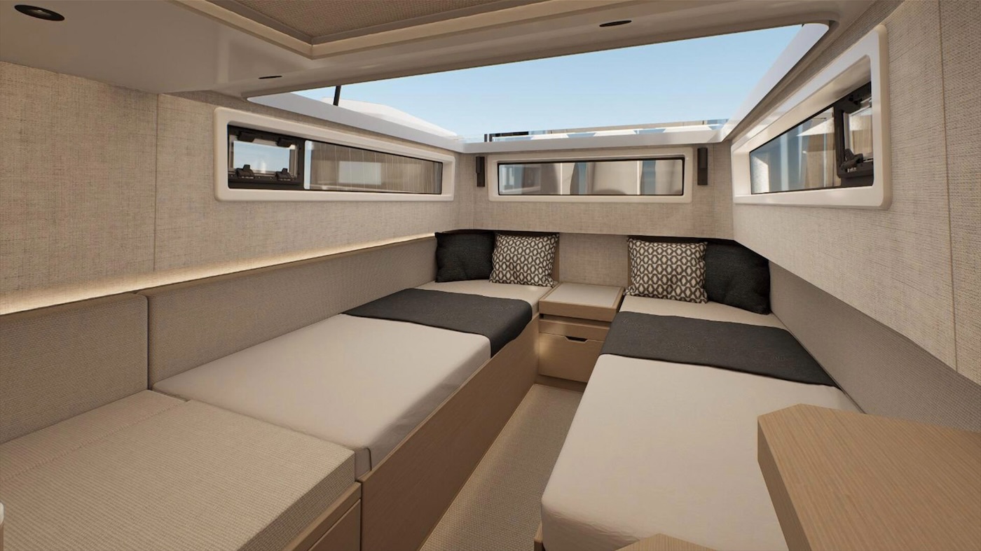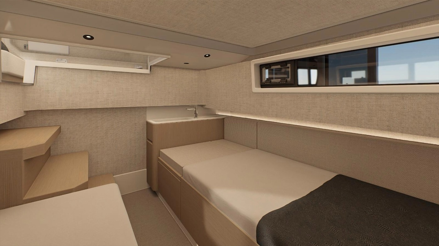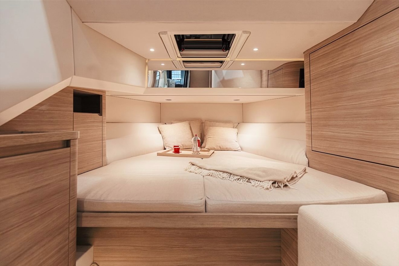Kabina dziobowa została uzupełniona o nową, podwójną kabinę śródokrętową (mid-cabin). Układ dopełnia łazienka z oddzielną kabiną prysznicową. Dzięki opcjonalnej kabinie rufowej jednostka może oferować łącznie trzy kabiny.
