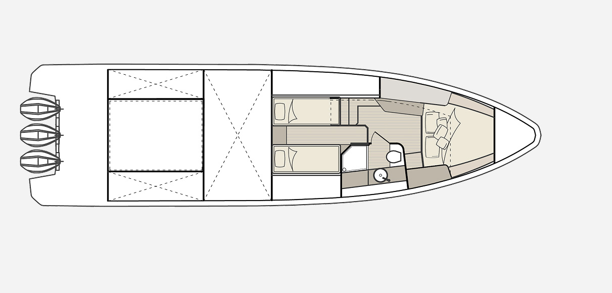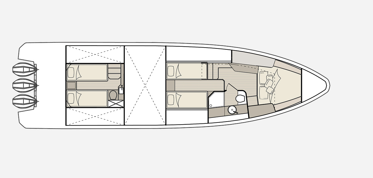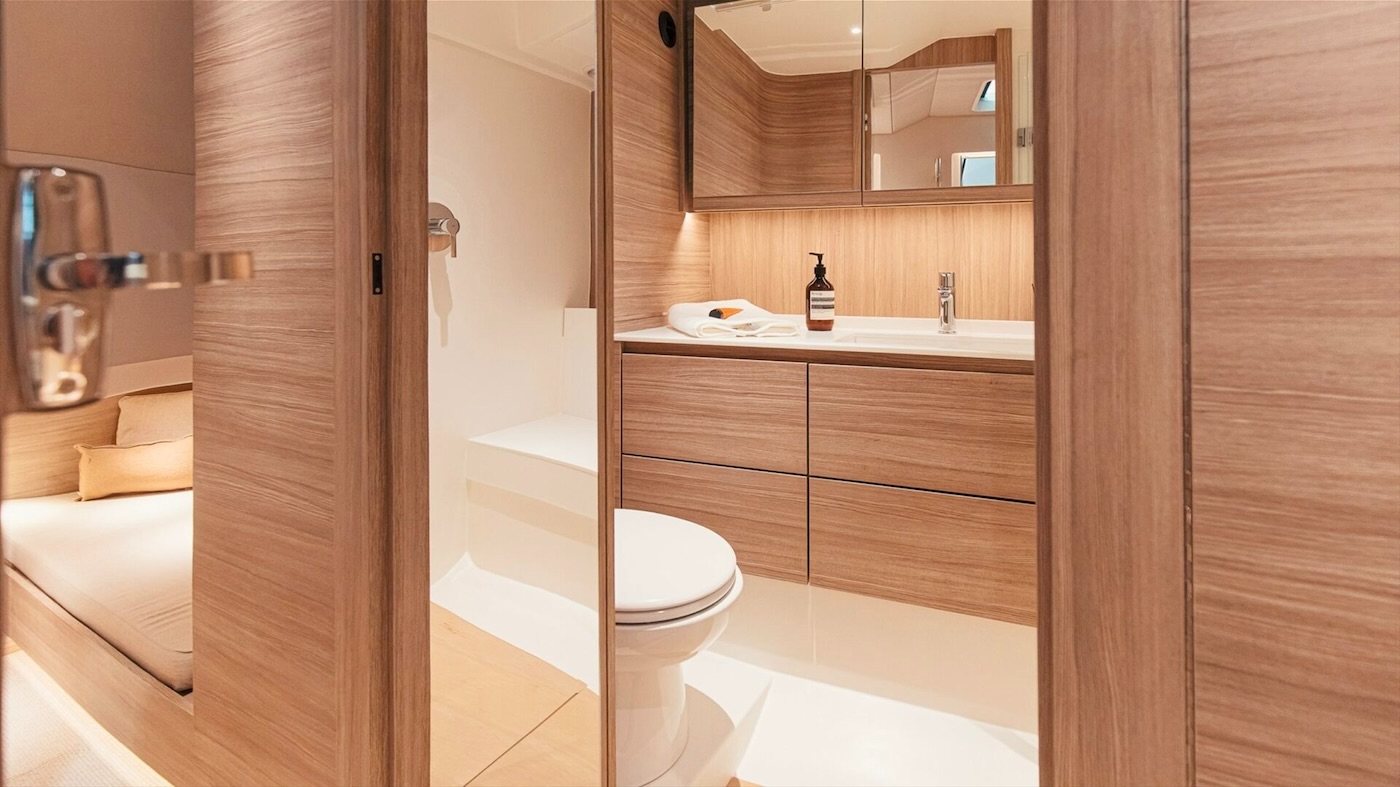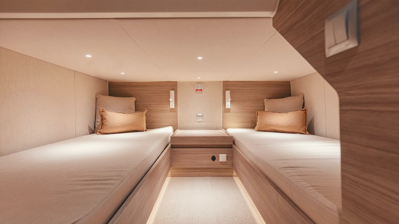 Kabina dziobowa została uzupełniona o nową, podwójną kabinę śródokrętową (mid-cabin). Układ dopełnia łazienka z oddzielną kabiną prysznicową. Dzięki opcjonalnej kabinie rufowej jednostka może oferować łącznie trzy kabiny.