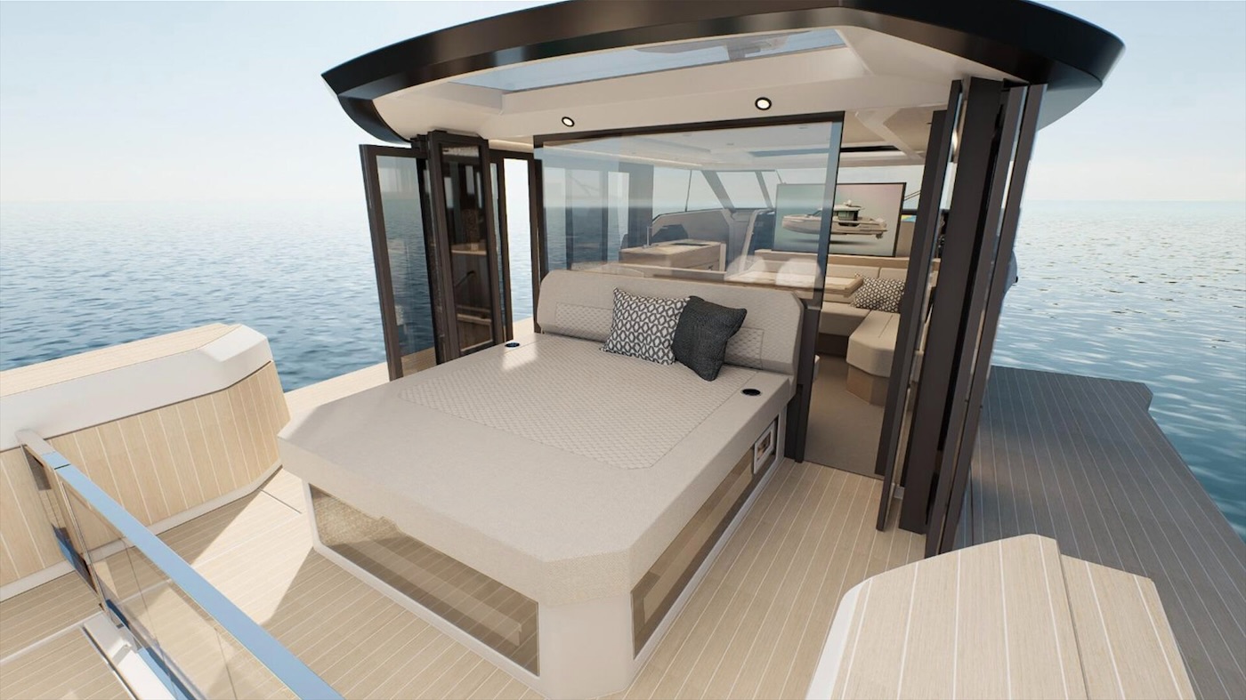 Saxdor 460 GTC przenosi charakterystyczną linię stylistyczną marki do największego i najbardziej zaawansowanego modelu w naszej ofercie. Ten flagowy jacht został zaprojektowany jako jednostka z silnikami zaburtowymi i sterówką na pełną szerokość kadłuba (full-beam wheelhouse), którą można całkowicie zamknąć lub całkowicie otworzyć. Przy zamkniętych drzwiach wnętrze pozostaje spokojne, jasne i doskonale wentylowane, oferując szerokie widoki od stanowiska sterowego aż po część jadalnianą (dinette). Po otwarciu przestrzeni granice między wnętrzem a pokładem niemal znikają.