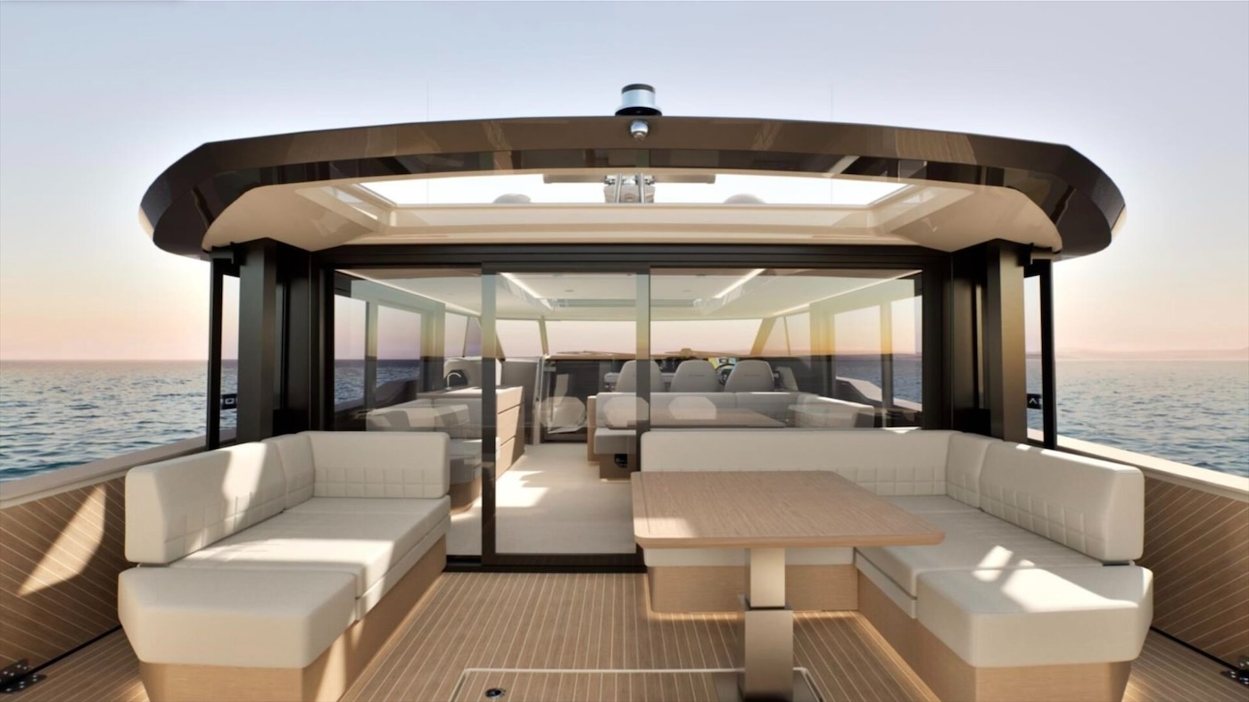 Krok po kroku sterówka otwiera się na otoczenie. Szklane elementy przesuwają się, dach cofa się do tyłu, a burtowe tarasy opuszczają się, przekształcając jednostkę z zamkniętej i spokojnej przestrzeni w jednolity pokład główny, płynnie połączony z otoczeniem.